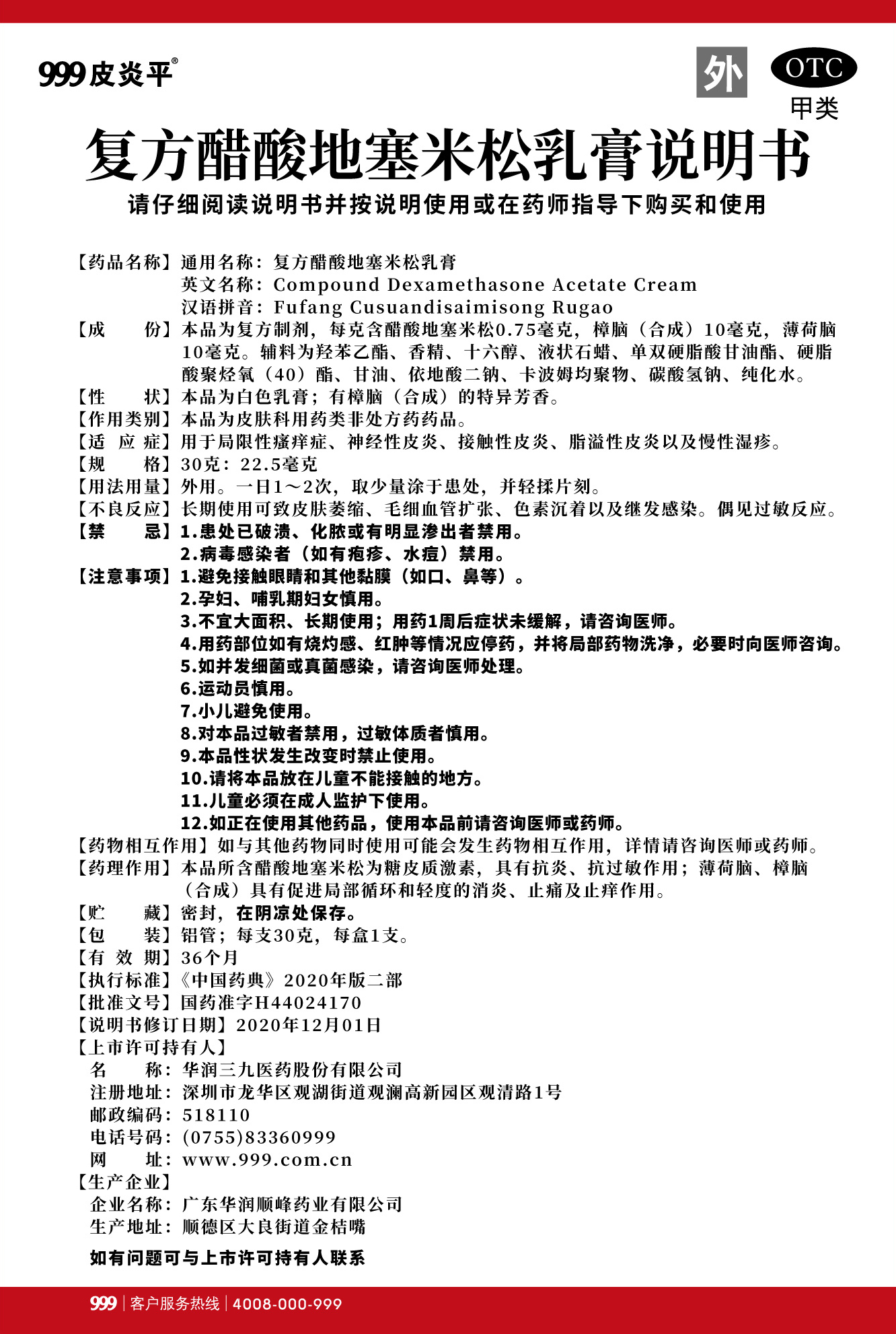 (999皮炎平)复方醋酸地塞米松乳膏